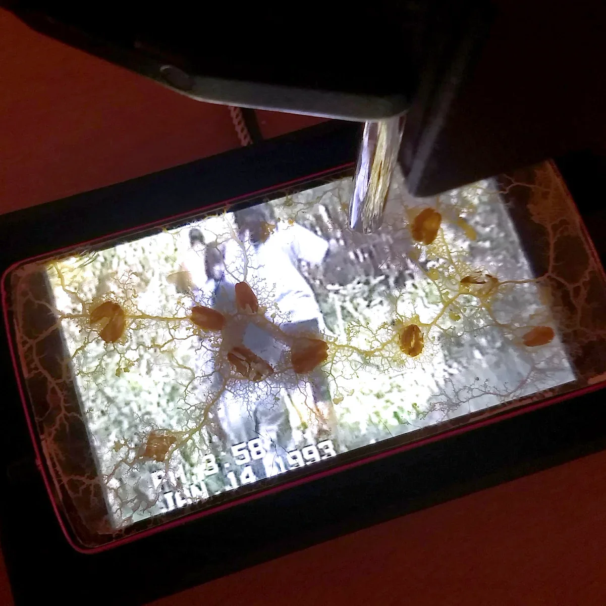 Physarum polycephalum sobre teléfono celular, microscopio digital sobre pantalla.